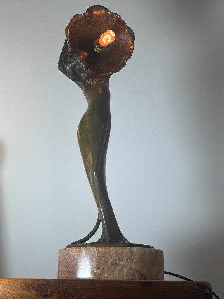 Lampe femme au pavot en bronze de Gyula Betlen 1900 sur socle laiton et marbre. 950 euros